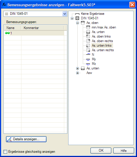 Je nachdem mit welchen Materialien Sie rechnen, wird auch eine Bemessung durchgeführt. Auch hier müssen Sie zunächst die passende Norm auswählen: Dann entscheiden Sie sich für das Bemessungsergebnis. Die Dialogbox müssen Sie dazu nicht schließen. Um also beispielsweise zwischen der Anzeige für AsX und AsY umzuschalten, klicken Sie einfach auf den passenden Eintrag im Baum rechts - das jeweils ausgewählte Ergebnis wird dann direkt im aktuellen Arbeitsfenster angezeigt. Mit der Schaltknopf "Details anzeigen" öffnen Sie das Details-Fenster, das sich von Norm zu Norm unterscheidet.