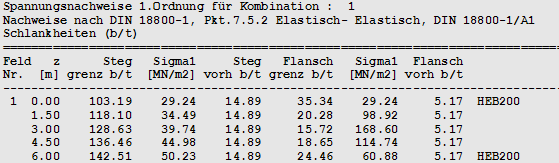 Die vorhandenen Blechverhältnisse von Steg und Flansch werden den zulässigen von den Randspannungen abhängigen Grenzwerten gegenübergestellt.