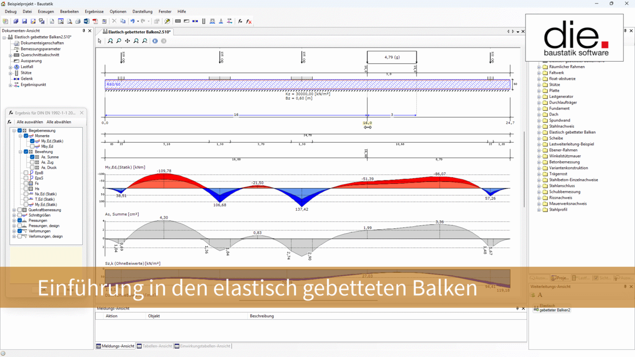 In diesem Lernvideo erfahren Sie, wie Sie einen elastisch gebetteten Balken in der Baustatik ganz einfach definieren, verändern, berechnen und ausgeben. Dabei wird der Träger zunächst mit der Schnelleingabe erfasst und dann manuell verändert. Dabei werden neben einigen Stützen auch eine Streckenlast als Einwirkung auf den Balken aufgebracht.
