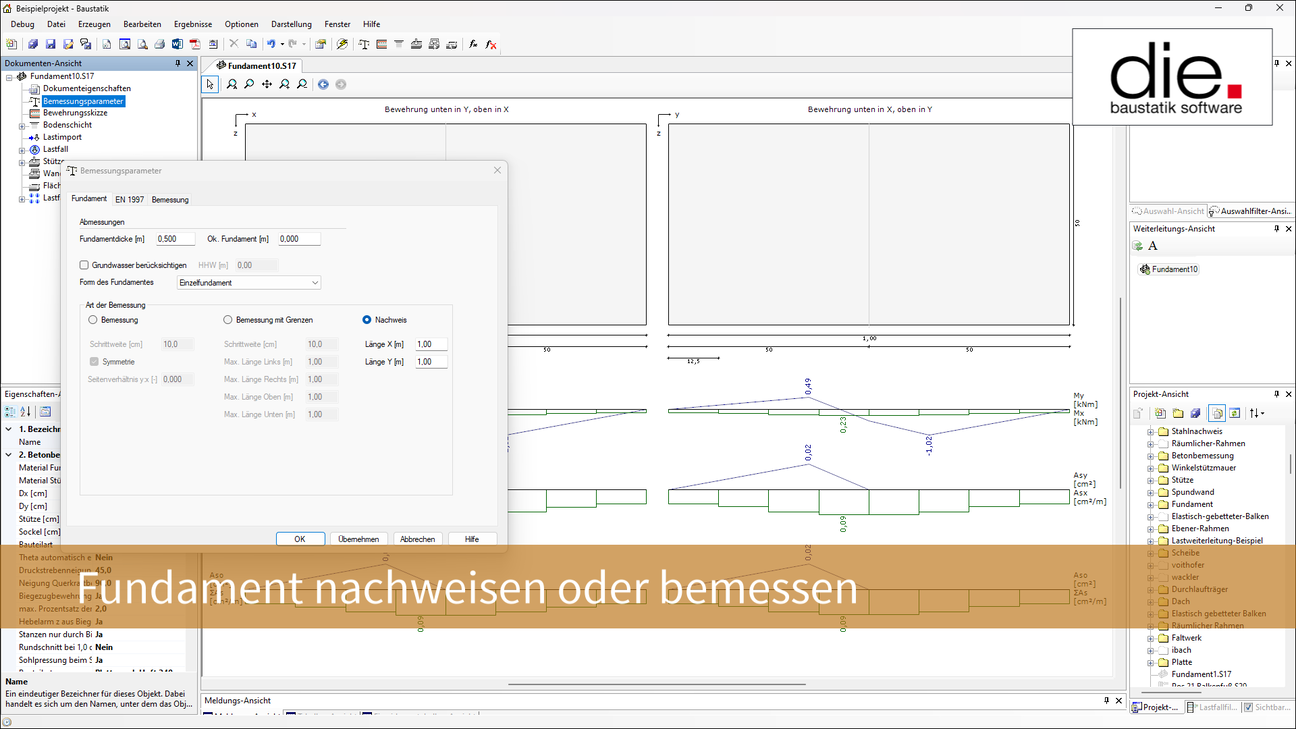 In der Schnelleingabe des Fundaments ist nur ein Wert für die Dicke des Fundaments vorgesehen, aber nicht für dessen Abmessungen. Das ist darum so, weil wie denken, dass die Bemessung bei der Eingabe von Fundamenten der Normalfall ist. Sie können Fundamente natürlich trotzdem ganz einfach auch auf Basis von Länge und Breite nachweisen und in diesem Video erfahren Sie, wie das geht.