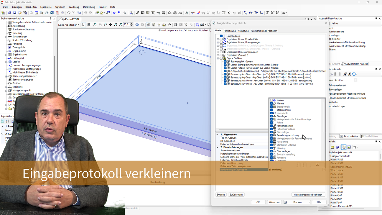 Auch das Eingabeprotokoll der Baustatik können Sie auf Wunsch im Umfang verringern: So möchten Sie zum Beispiel keine Knotentabellen mit ausdrucken, weil die Ausgabe ohnehin eine vermasste Systemgraphik enthält. In diesem kurzen Video lernen Sie, wie Sie das Protokoll der Eingabedaten auf die zwingen notwendigen Angaben reduzieren können.