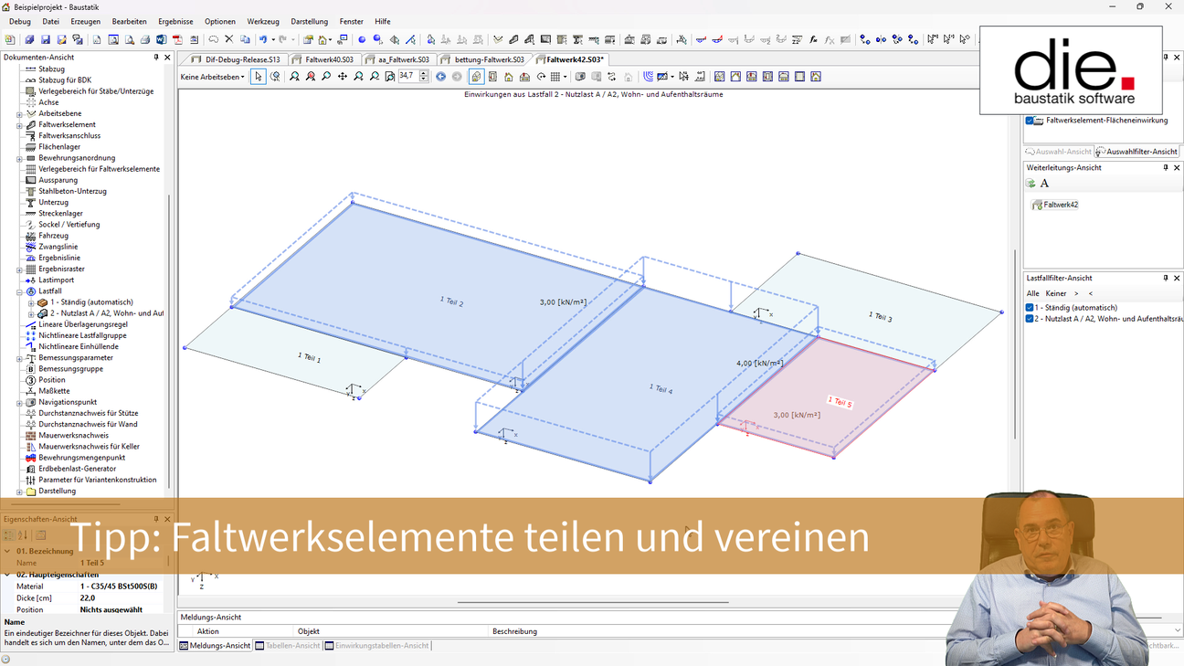 Oft möchte man eine als ganzes Polygon geschlossen eingegebene Platte in einzelne Felder zerteilen. In anderen Fällen will man genau das Gegenteil, nämlich verschiedene kleinere Felder zu einer großen Platten zusammensetzen. Je nach Aufgabenstellung sind beide Vorgänge schon aus organisatorischen Gründen oft wichtig. In der Baustatik können Sie darum beides auch sehr einfach bewerkstelligen.